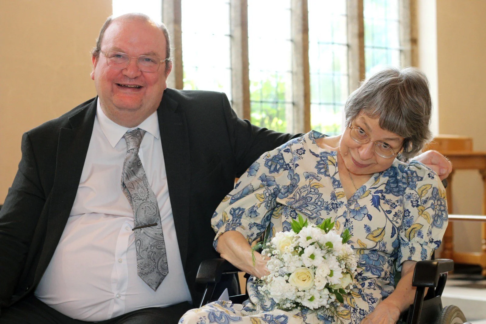 “My husband, Reuben and I recently had a renewal of wedding vows service. I have MSA, a condition similar to Parkinsons, but more severe and it progresses more quickly. It is common for people with MSA to struggle with their speech, as I do. I had been having speech therapy with Louise for a while and decided to ask her to help me with saying the vows. She was brilliant, my husband and I were able to practice together with Louise over Zoom and it went really well on the day. We had a microphone, but that alone wouldn’t have made my speech clear. The guests said they could hear every word clearly! It was all thanks to Louise!”